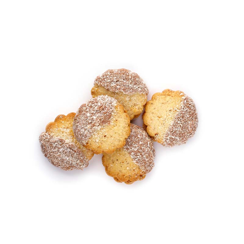 Dukati so sestavljeni iz dveh piškotnih polovic, ki sta med seboj povezani z okusnim polnilom - masleno čokoladno kremo. Za še bolj bogat okus in še lepši izgled je vsak pomočen v čokolado in paniran v kokos. So izredno krhki in topljivi piškoti, ki imajo okus po orehih, čokoladi in lešnikih. Prepusti se skušnjavi in uživaj v trenutku.